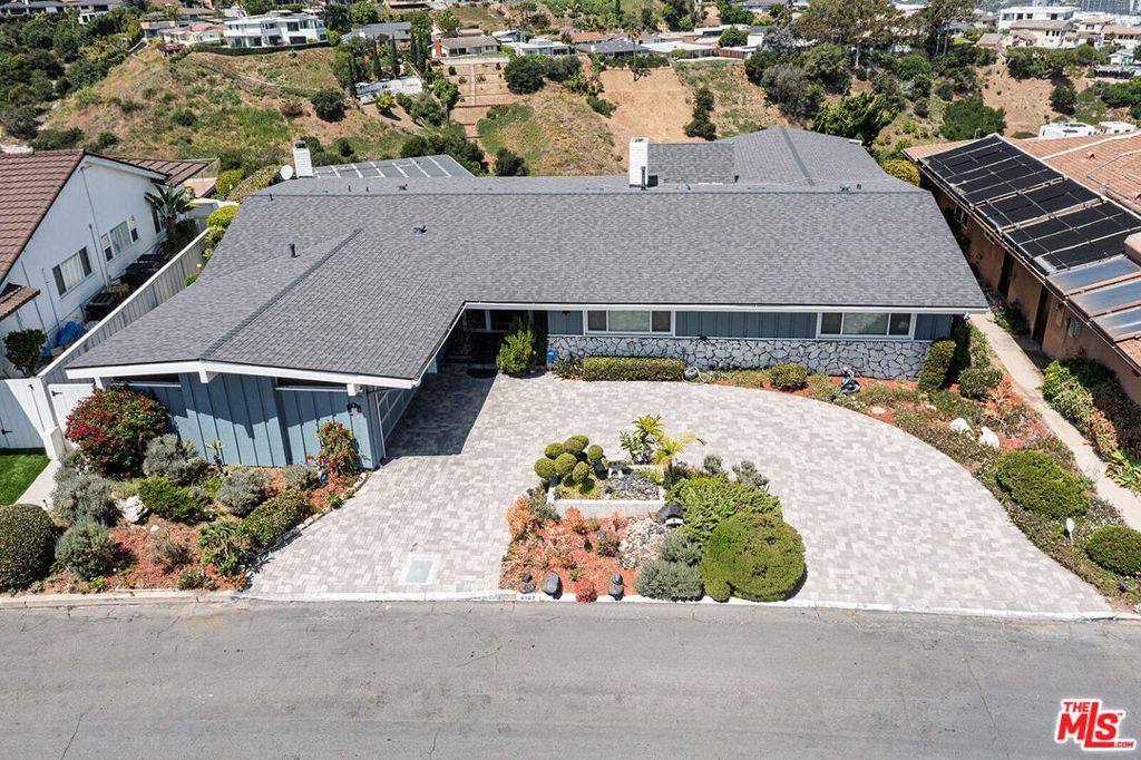 Perched at the top of the hill in the highly desirable Baldwin Vista neighborhood, this striking mid-century modern home offers privacy, space, and sweeping rear-facing views from Century City to the iconic Hollywood Hills sign. Set on an expansive 30,913 sqft lot, this 4-bedroom, 4-bath residence features approximately 3,546 sqft of thoughtfully designed living space, ideal for both quiet enjoyment and effortless entertaining. A semi-circular paver driveway welcomes you to a classic mid-century wide entry door with frosted twin sidelights. Inside, a formal entry showcases large format terrazzo flooring and flows into a spacious living room with a fireplace and double glass sliders that open to a deck overlooking the pool, rolling hills, and beautiful cityscape. The kitchen is well appointed with stone countertops, stainless steel appliances, a generous 7-foot peninsula, an eating area with parquet wood flooring, and a separate walk-in pantry. A short staircase leads to a lower-level family room featuring a wall fireplace and glass sliders that open to the backyard. A nearby bathroom offers potential for direct outdoor access, making it ideal as a future pool bath and changing area. The expansive and private primary suite is a true retreat, complete with an attached office featuring built-ins and bookshelves, a large walk-in closet plus a separate cedar-lined closet, and a wood-beam ceiling. Glass sliders open to a private deck, with an additional door providing direct backyard access. The en-suite bath includes dual vanities, a spa tub, separate shower, and a dedicated makeup vanity accented by a mini chandelier. Three additional bedrooms are generously sized and offer flexibility for family, guests, or workspace needs. The backyard is designed for relaxation and entertaining, featuring a heated pool and stunning views of the Baldwin Vista hills, Kenneth Hahn Park, and the surrounding city. Additional amenities include central air and heat, a laundry room with utility sink, abundant storage throughout, and a 2-car garage. This is a rare opportunity to own a private hillside retreat with classic mid-century character and breathtaking panoramic views! Come be the newest neighbor! (Some photos have been virtually staged)